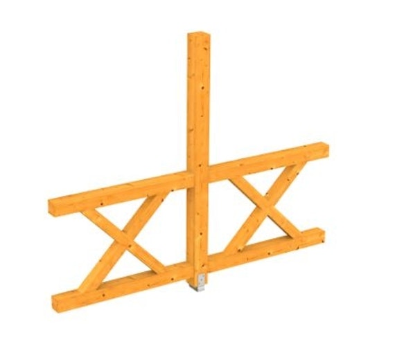 Die dekorative Skan Holz Seitenwand mit massiven Andreaskreuzen aus Konstruktionsvollholz eignet sich für freistehende Skan Holz Terrassenüberdachungen aus Leimholz. Die Konstruktion ist aus Konstruktionsvollholz (KVH) gefertigt. Als KVH bezeichnet man technisch getrocknetes, endlos verleimtes, massives Fichtenholz. Die einzelnen Holzteile werden getrocknet, nach Fehlern gescannt, sortiert und anschließend wetterfest durch Keilzinken miteinander endlos verleimt. Risse, Äste und leichte Verdrehungen spiegeln den Charakter der eingesetzten Materialien wider.