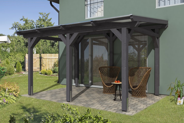 Die Terrassenüberdachungen "Siena" aus Leimholz  von Skan Holz können freistehend im Garten aufgestellt werden und sind somit räumlich flexibel und zugleich fassadenschonend.