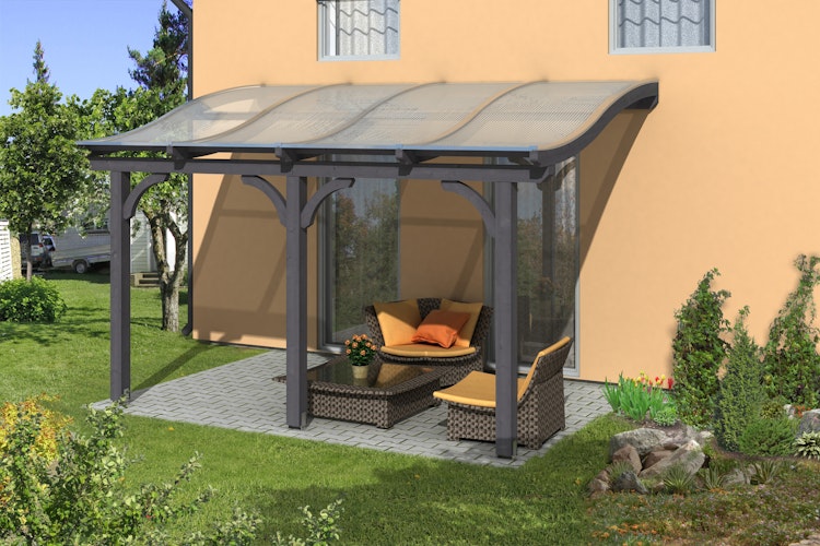 Stilvolle und langlebige Skan Holz Terrassenüberdachung Venezia aus hochwertigem, verwindungs- und rissarmem Leimholz, ideal geeignet für farbige Anstriche