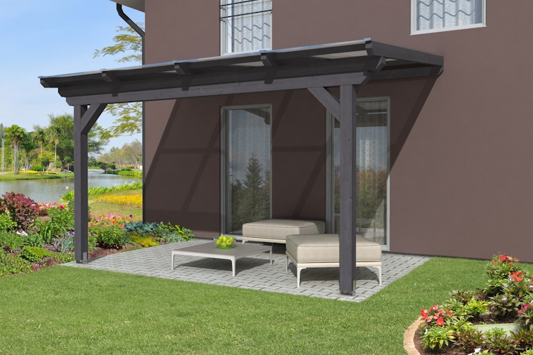Robuste und langlebige Skan Holz Terrassenüberdachung Ancona aus hochwertigem Leimholz, ideal geeignet für farbige Anstriche - ohne Mittelpfosten.